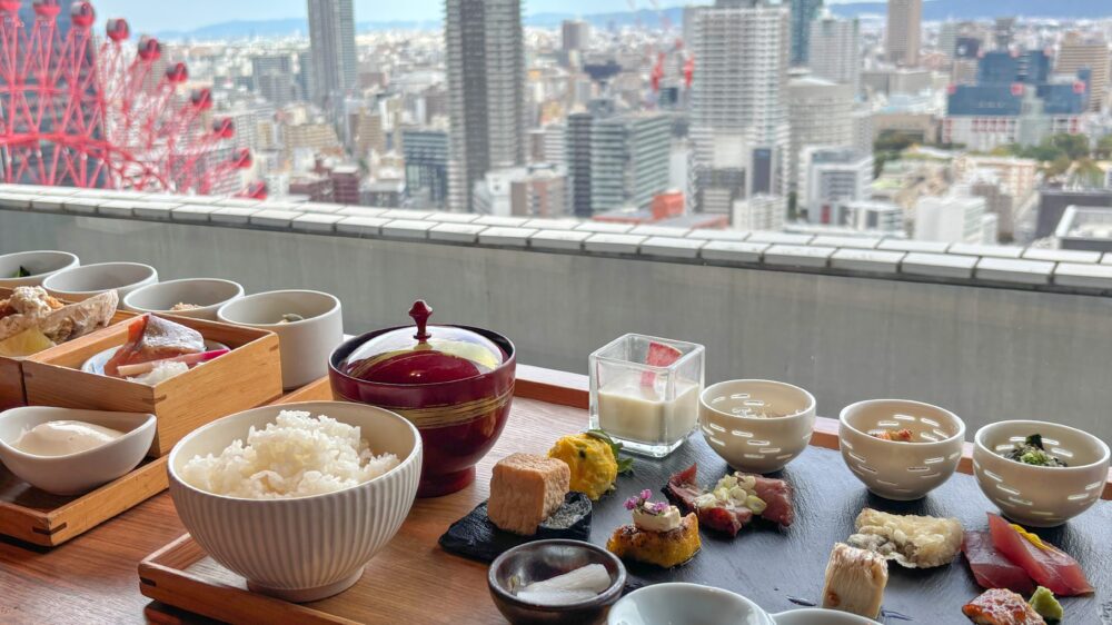 南側が全面ガラス張りで、大阪の街と空の絶景を楽しめます。窓側の席は埋まりやすいので、予約がおすすめとのこと。