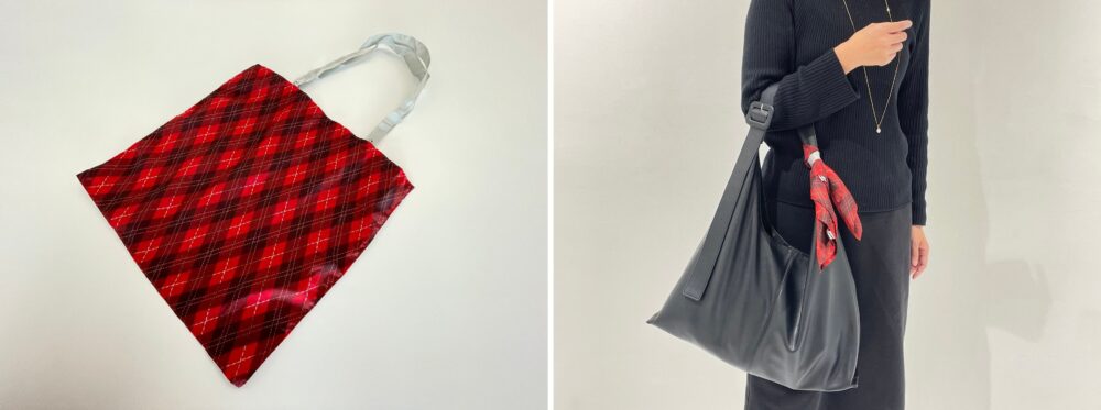 スカーフがエコバッグに早変わりするフェリシモの定番人気商品「スカーフエコバッグ(R)」の神戸ポートタワーチェック柄の特別バージョンです。いつもバッグにとめ付けておくことができます。