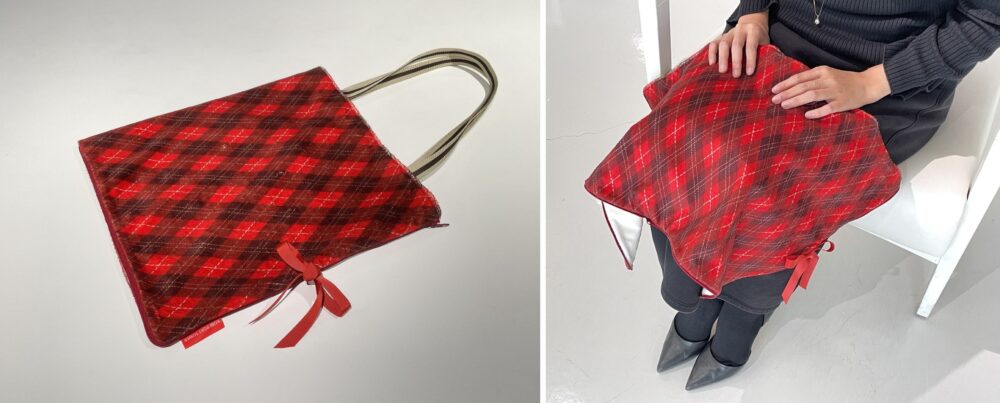クリスマスシーズンや冬のお出かけに、バッグのファスナーを開くとブランケットになるトートバッグ。表も内側も起毛素材を用いており、肌寒い季節のお出かけ先でサッと広げるとあたたかなブランケットに変身します。