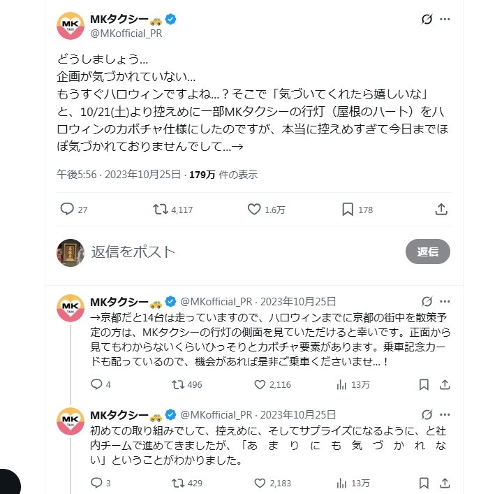 当初は行灯側面に小さなかぼちゃシールを貼るのみでしたが、あまりに気づかれず、公式Twitter(現X)で「どうしましょう…企画が気づかれていない…」と投稿したところ、170万インプレッション・1.5万件の「いいね」がつく大反響になりました。