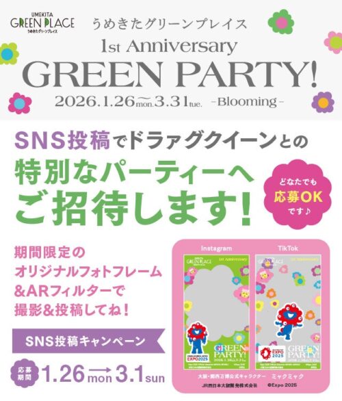 フィルターを使用して撮影した画像や動画を「#うめきたグリーンパーティー」のハッシュタグを付けてInstagramもしくはTikTokに投稿すると、抽選で“UMEKITA GREEN PARTY “に参加できます。