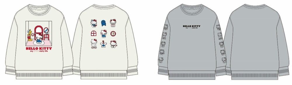 グレーは袖にキティのワンポイントを並べた、シンプルながら存在感のあるデザイン。落ち着いたカラーで、カジュアルにもルームウェアにも合わせやすいアイテムです。