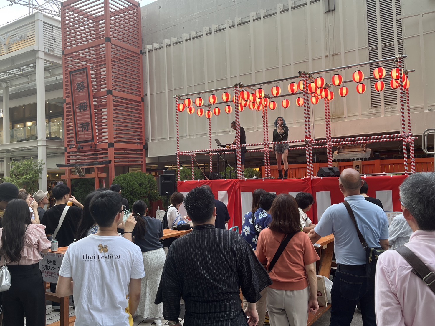 やぐらステージの前には、ビール片手にグルメなどを楽しめるテーブルもあるみたい。難波でのお買い物のついでに立ち寄ってみてはいかがでしょうか。