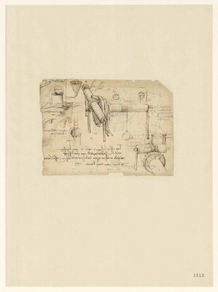 『アトランティコ手稿』第1112紙葉 表《巻き上げ機と油圧ポンプ》(1478年頃 203×286mm)