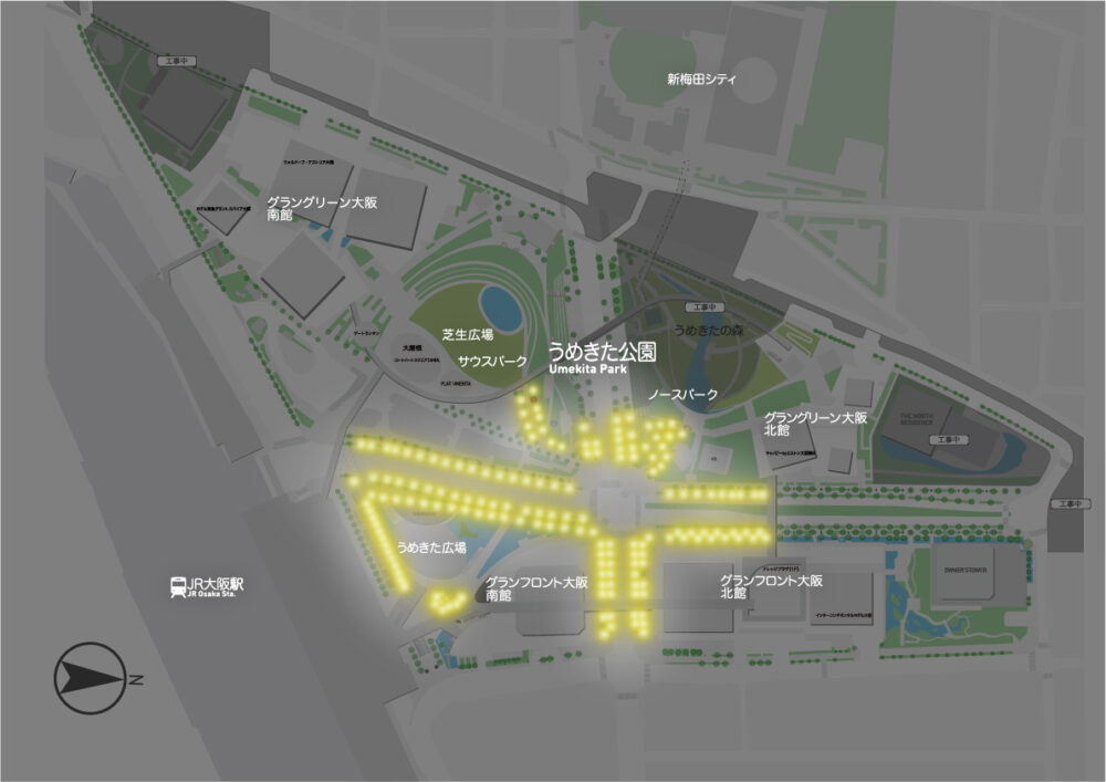 南北は「うめきた広場」からグランフロント大阪北館の西側の街路樹まで、東西はグランフロント大阪の北館・南館の間にある街路樹から「うめきた公園」まで点灯されます。