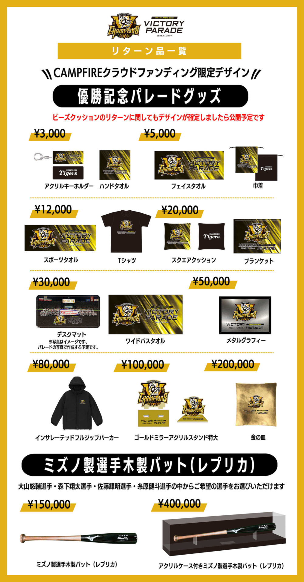 クラウドファンディングで支援すると、リターンとして限定デザインの「優勝記念パレードグッズ」や「ミズノ製選手木製バット(レプリカ)」がもらえたり、パレード当日に選手を間近で見られる「特別観覧エリア・超特別観覧エリア」で観覧体験ができたりするんだそう。