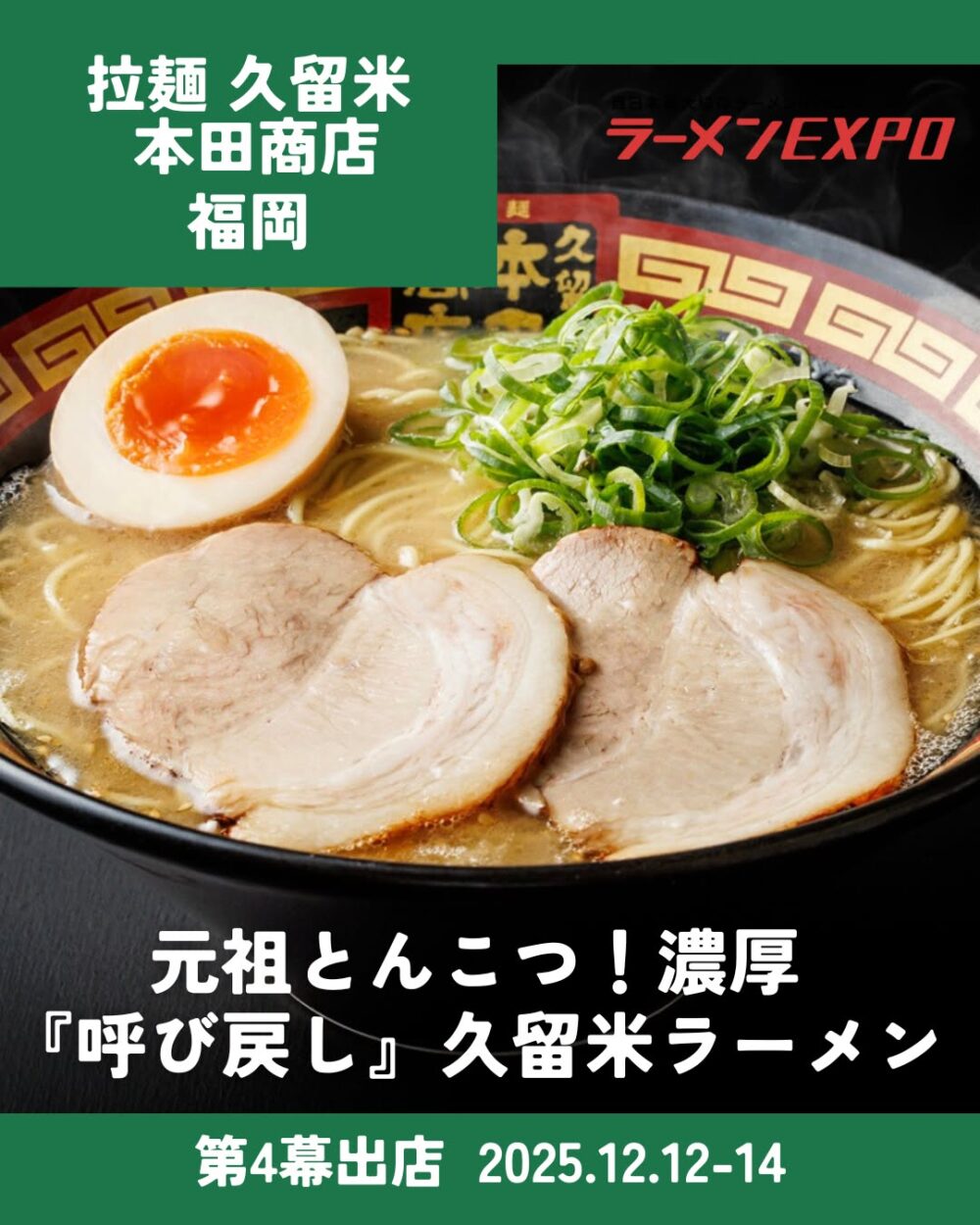 12月12日~14日に開催される「第4幕」では、とんこつ発祥の聖地・福岡県久留米市の大人気店「拉麺 久留米 本田商店」や、熱々のラードで仕上げた本場札幌の味噌らーめんが味わえる「札幌 麺部屋 綱取物語」などが登場するんだそう。