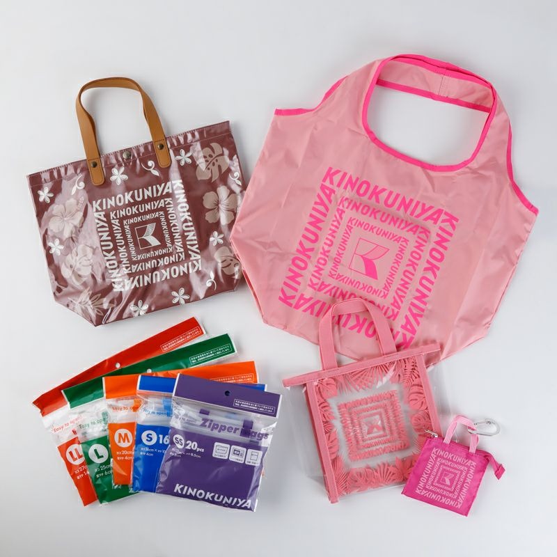 ピンクのエコバッグやミニバッグ、保冷バッグなど、デイリーに使えるバッグとサイズ違いのスライドジッパーバッグがバラエティ豊かに詰め合わされています。