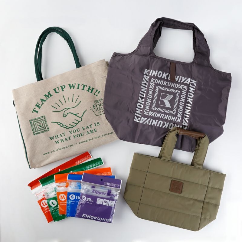 グランドフードホール コラボバッグMグリーンやキルティングトート、まとまる保冷バッグとサイズ違いのスライドジッパーバッグのセット。