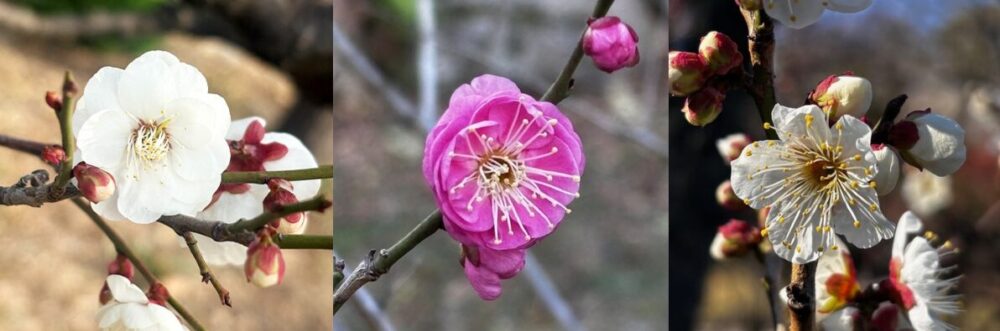 梅の花は、1月下旬ごろから3月下旬にかけてどんどん見ごろになっていきます。色々な品種が見れる機会になりそうですね。