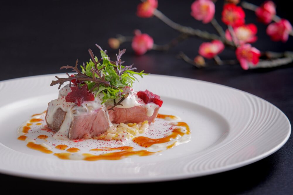 鉄板焼「けやき」では、梅の酸味とバターのコクが魚の旨味を最大限に引き出す「鮮魚の鉄板焼 梅香るバターソース」や、メインには厳選された「国産牛サーロイン」や「国産牛フィレ」が味わえるコース。