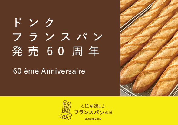 神戸の老舗ベーカリー「ドンク」とその他グループブランドで、フランスパン発売から「60周年」を記念するキャンペーンが開催され、11月28日の「フランスパンの日」に来店すると、焼きたてのフランスパンが無料でプレゼントされます。