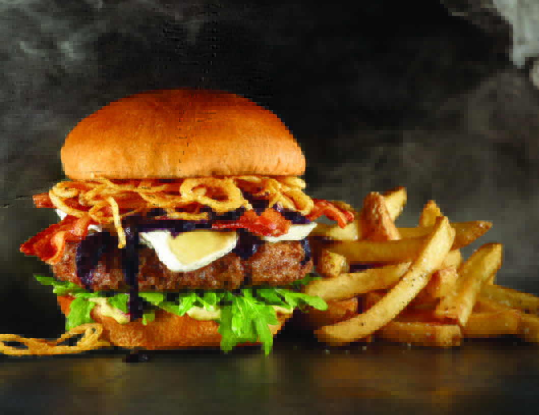 マスタードマヨネーズを塗ったバンズにルッコラ、カマンベールチーズ、ブルーベリーソース、ベーコン、フライドオニオンがトッピングされたハンバーガー。