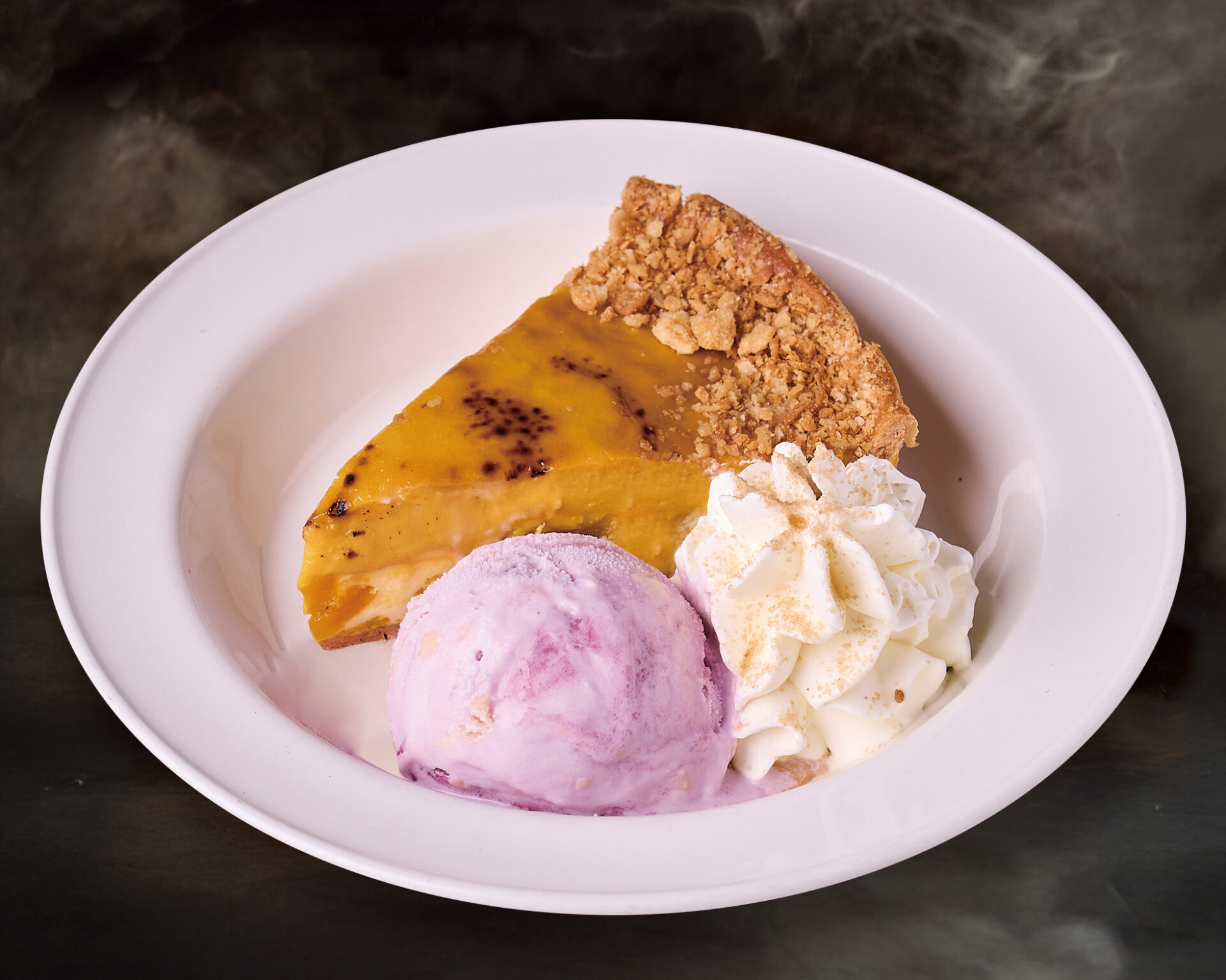 パンプキンカスタードタルトに生クリーム、シナモンシュガー、紫芋アイスクリームがトッピングされたデザートです。