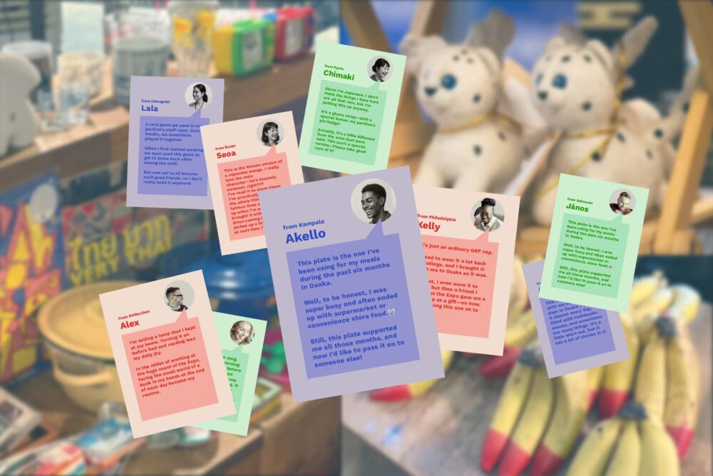 万博のパビリオンで実際に使われていたアイテム、あるいはパビリオンスタッフが使用していたものが並びます。たとえば衣装、ノベルティ、レストランや展示に使われていた雑貨など。残ったものや余ったものも、捨てずに誰かへ引き継ぐことができます。