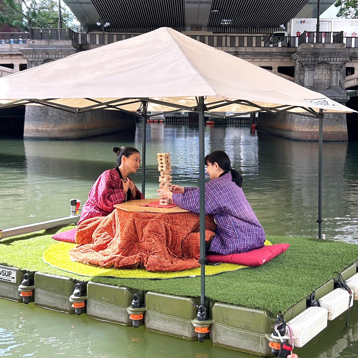 川に浮かぶイカダの上にこたつを乗せて、ピクニックが楽しめる「こたつ水上ピクニック」。
