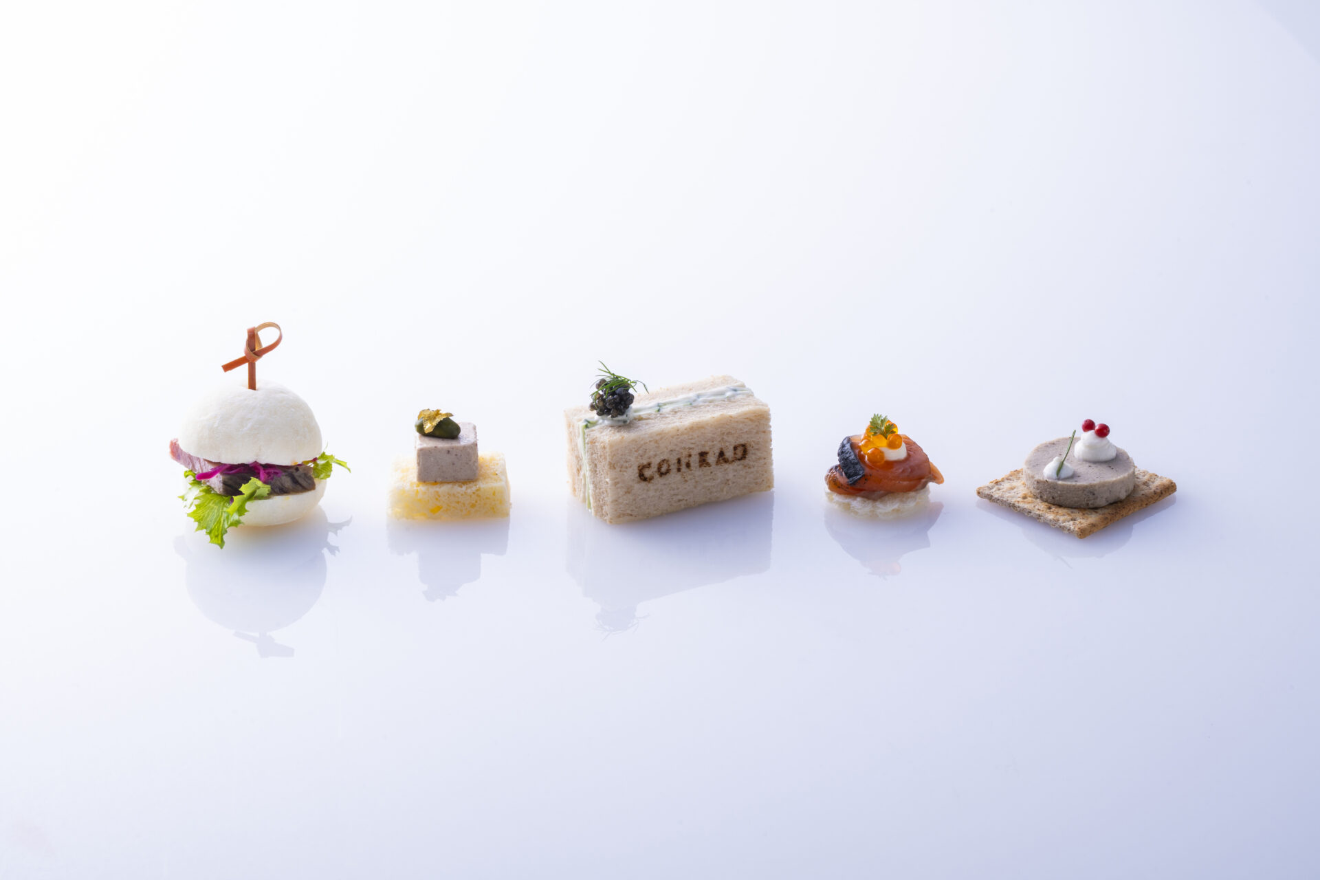 左から「ローストビーフスライダー」、「栗と淡路島レモンのスパイスバター」、「キューカンバーサンドイッチ」、「竹炭塩でマリネしたサステナブルサーモン」、「平飼いチキンのムース」