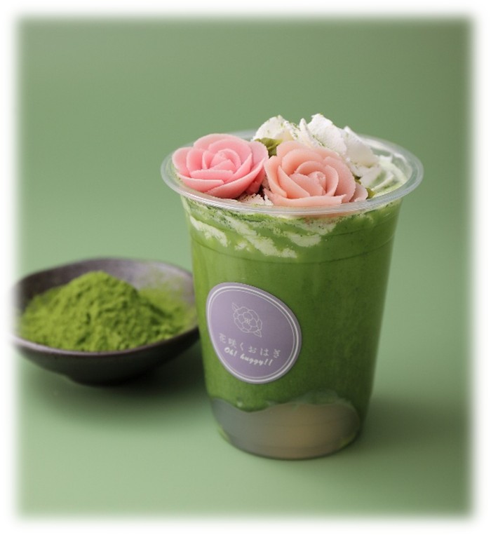 抹茶ラテやほうじ茶ラテにわらび餅を加え、ホイップクリームと餡フラワーが乗ったドリンクです。