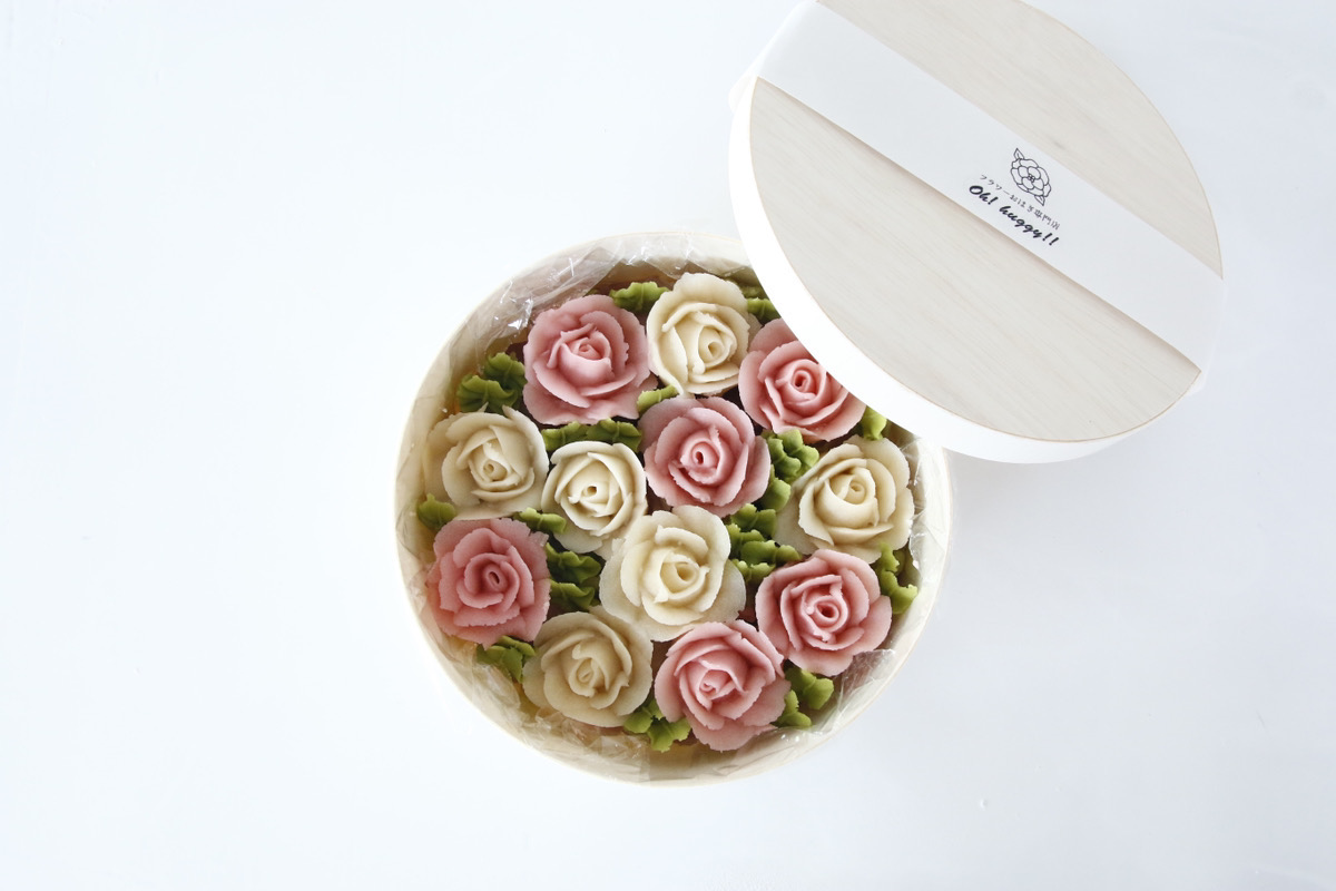 ギフトにも最適な「フラワーおはぎBOX」。7個のおはぎの上に、優しい味の和栗餡が敷きつめられ、天然色素で色づけた白こし餡で丁寧にしぼりあげたバラがちりばめられています。