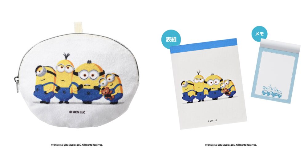 丸型の「ポーチ」は、仲良しのミニオンたちが集まった姿をデザイン。お気に入りの「ティム」を大切に抱える「ボブ」の姿や、ぎゅっと密着する4人の姿がポイントだそうです。