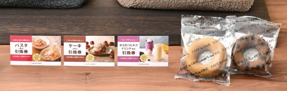 商品引換券は、「パスタ(単品)」「ケーキ(単品)」「からだハピネス(R)ドリンク(単品)」の3品分が入っているほか、「塩キャラメルドーナツ」と「ベルギーチョコドーナツ」の2種類詰め合わせも。