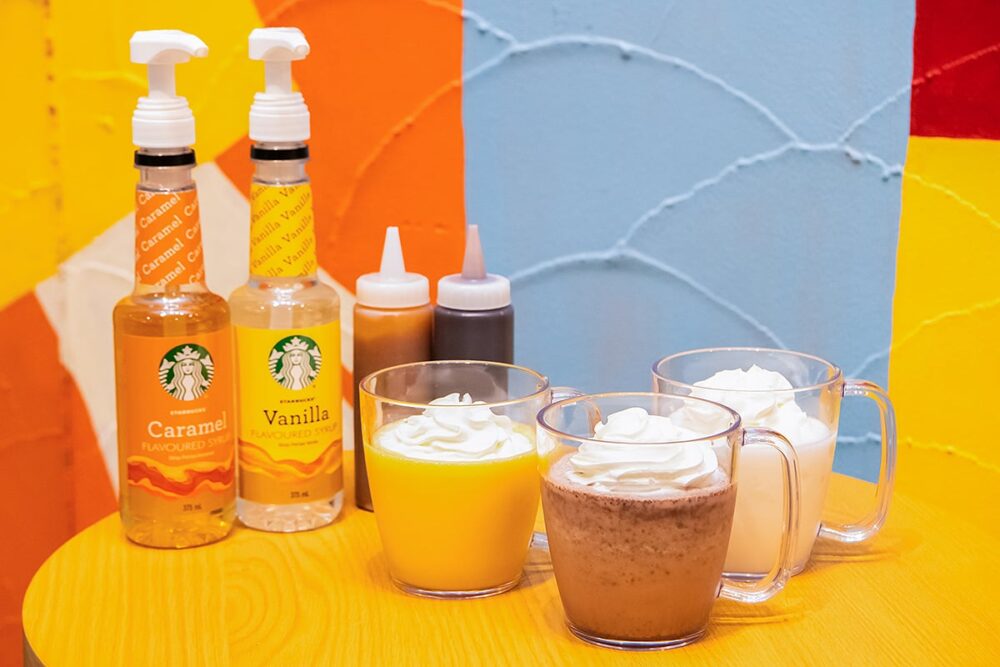 キッズフラペチーノを注文すると、オリジナルのテーブル「コンディメントバー」を使って味のカスタマイズを体験できるようです。