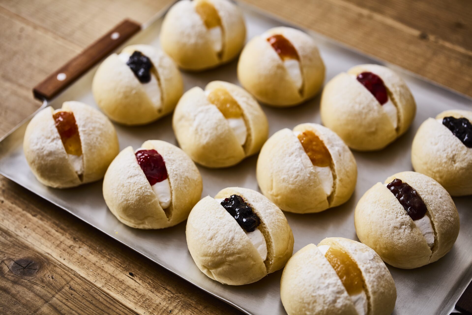 フレーバーはトウモロコシ、カシス、あまおう苺、ブラッドオレンジ、フルーツミックスようなの5種類で、生地のほんのり甘い風味とジャムの味わいが絶妙にマッチする、ここだけで楽しめる限定パンです。