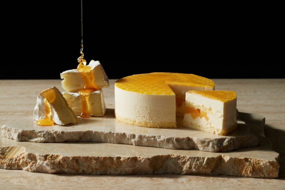 カマンベールムースと蜂蜜ムースに蜂蜜ジュレをあしらった2層のハニーチーズケーキ。
