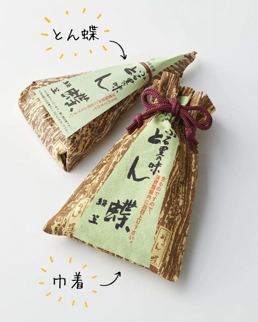 今回は、根強いファンがいる懐かしのパッケージが、巾着袋になって「とん蝶」1個をセットにして販売されています。期間・数量限定です。