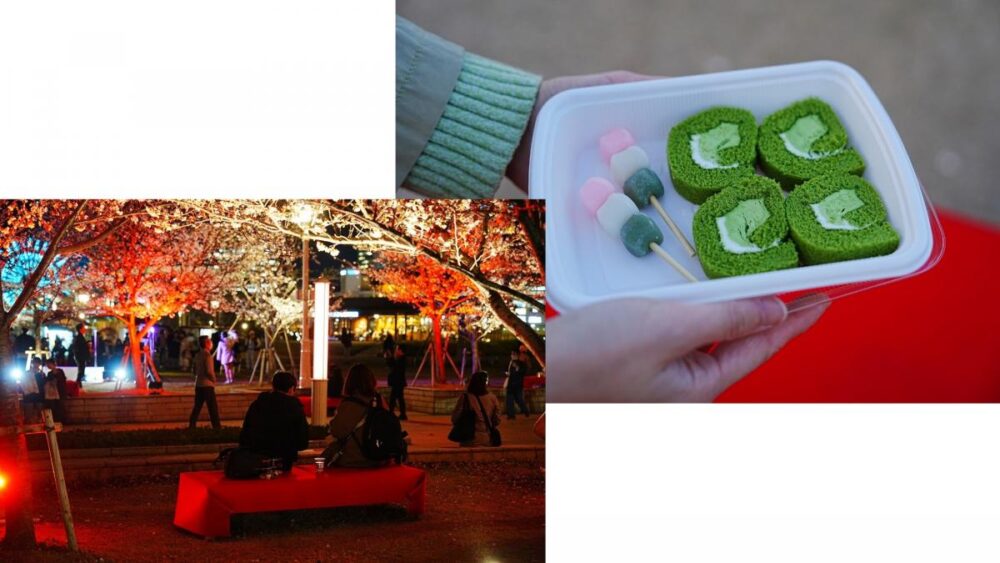 お花見仕様の休憩ベンチ(床几台:しょうぎだい)も設置され、ライトアップされた桜の木々の下、夜桜鑑賞とお花見フードを楽しめるみたいです。