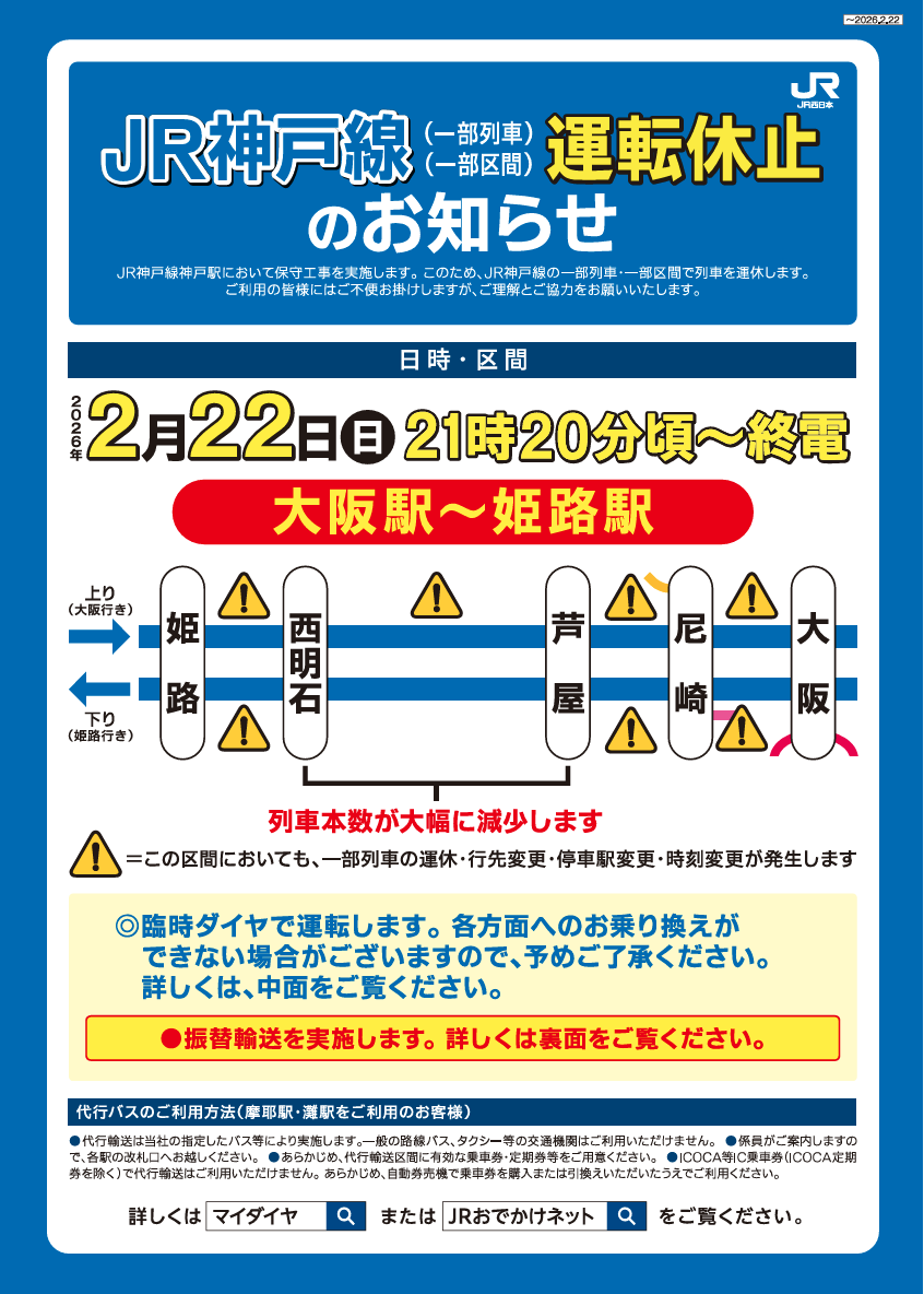JR神戸線の「大阪駅~姫路駅」の一部列車・一部区間が、2026年2月22日(日)に運転休止となります。